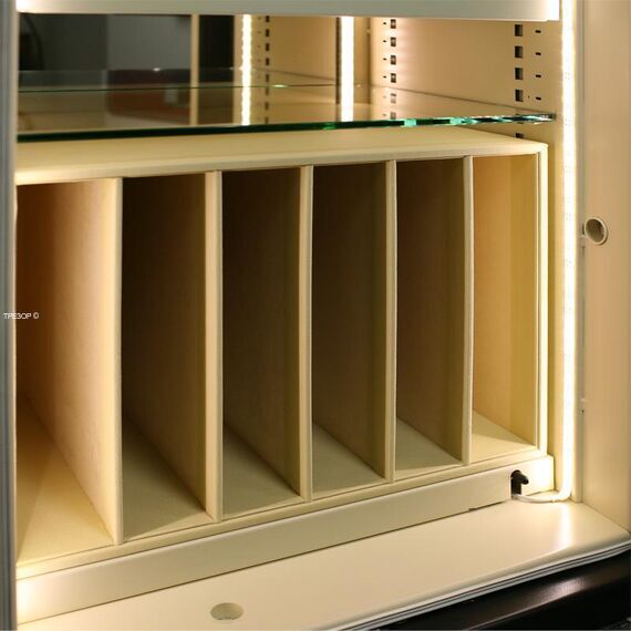Контурная посветка внутреннего пространства для сейфов KASO. Устанавливается по переднему или заднему контуру. На фотографии показан пример интерьера с подсветкой, стеклянной полкой и специальной кожаной вставкой под папки с документами.
