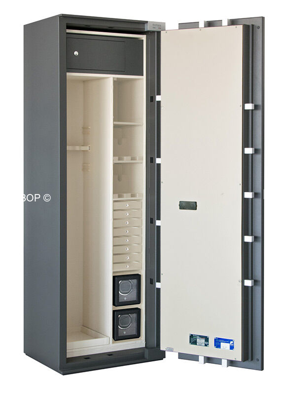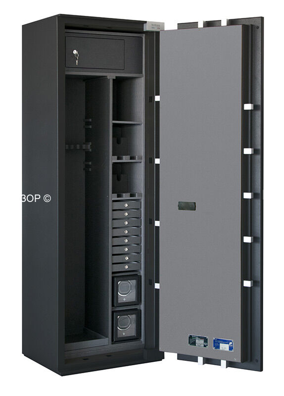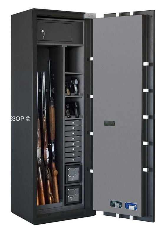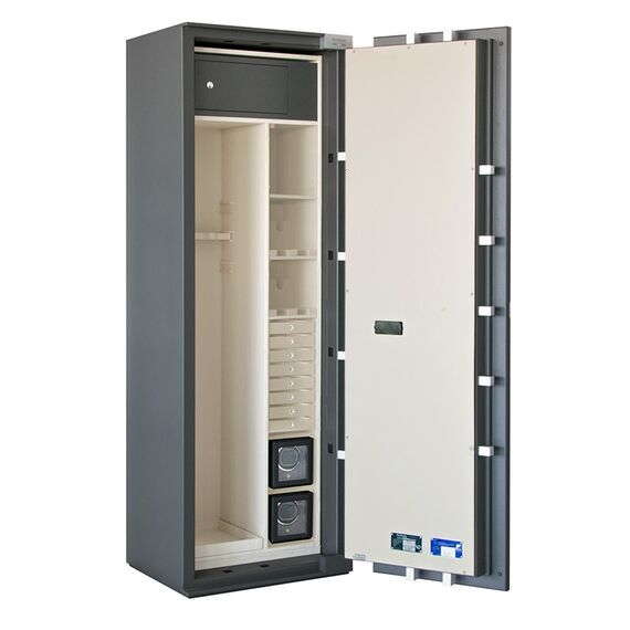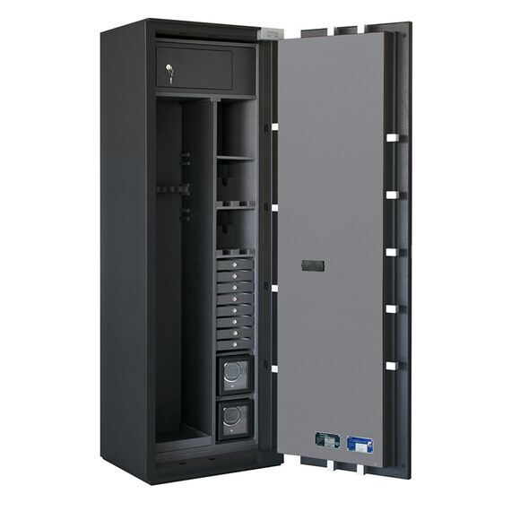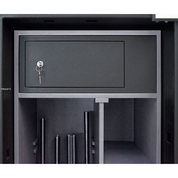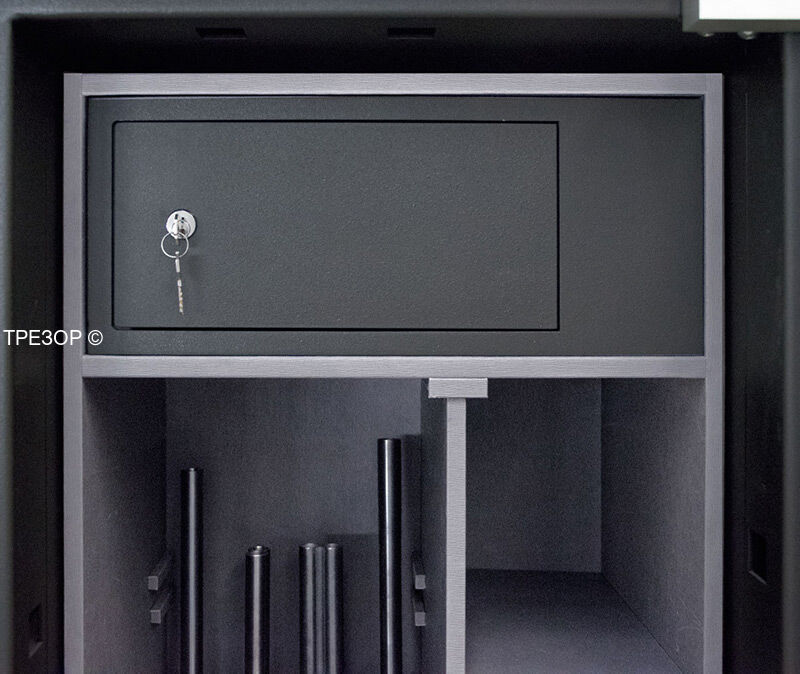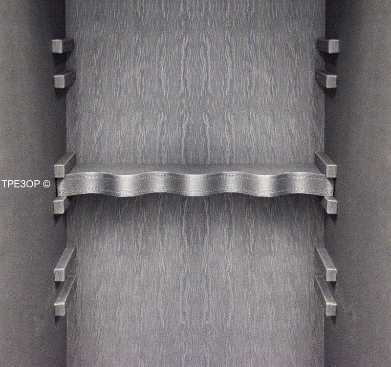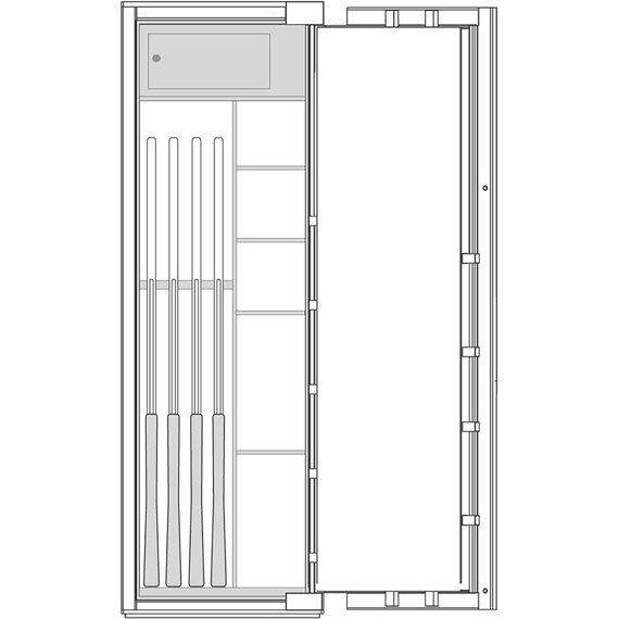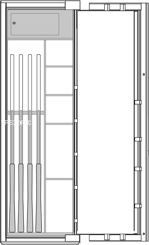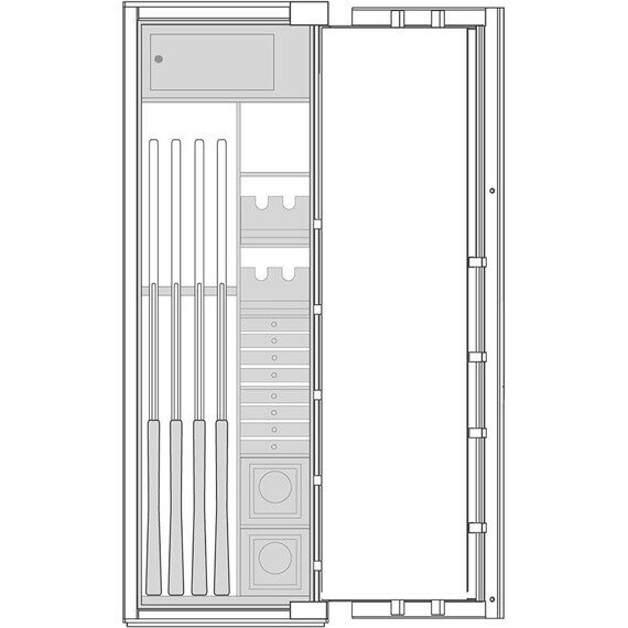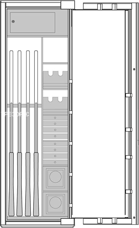 Премиум модульный интерьер рассчитан на хранение 4 охотничьих ружей и включает в себя запираемое отделение и модуль для хранения разнообразных предметов: короткоствольные пистолеты, мелкие предметы, ювелирные украшения. Или просто механизмы для подзавода часов, которые унифицированы со стандартными модулями для всех моделей сейфов серии BRIXIA.