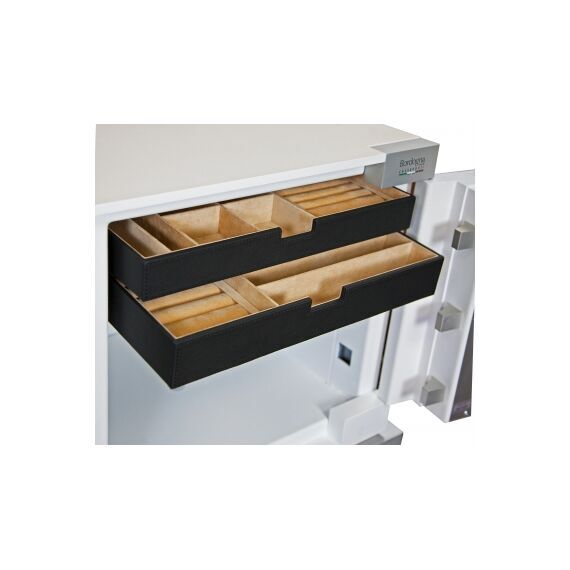 Начинка ящиков выполнена из износоустойчивой замши по эскизу заказчика либо из предложенных вариантов с универсальным заполнением для удобного хранения различных украшений. Размеры ящиков зависят от модели сейфа, а высота от хранимых украшений: все нюансы максимально продуманы и многократно испытаны.