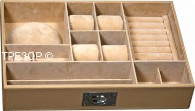 1. Ювелирная вставка представляет собой отдельный модуль, оснащённый выдвигаемыми лотками, каждый из которых разделён на индивидуальные секции, оптимизированные для размещения различных ювелирных украшений или часов.