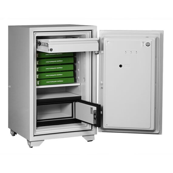 Окраска: матовый светло-серый RAL 9002. Высота сейфа включает колесики для удобства перемещения по офису, высотой 60 мм.