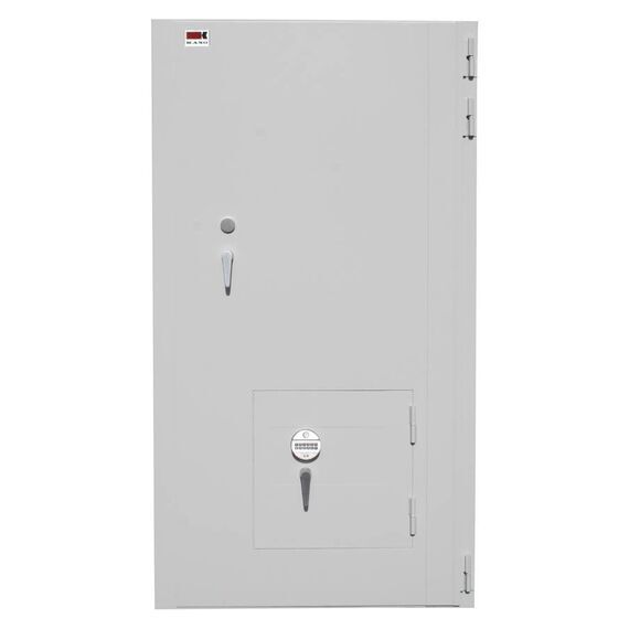 Цена приводится за базовую версию двери: стандартный размер, правое открывание, один ключевой замок класса B с парой ключей, рама для монтажа под бетонирование, окраска в цвет RAL 7035, сертификация по EN 1143-1 класс III.