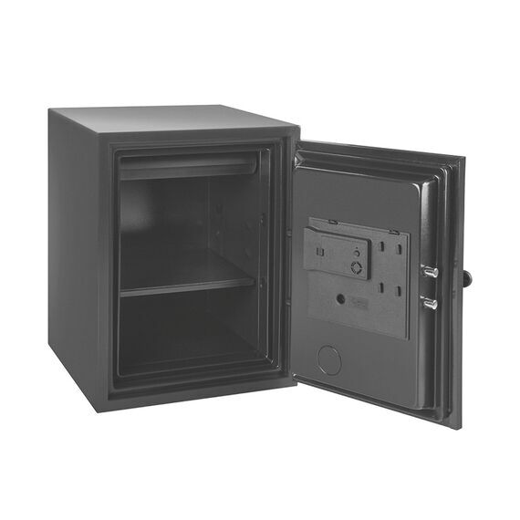 Корпус и дверь: 2х слойный стальной прокат толщиной 1 мм заполнен сертифицированным огнеупорным композитом (вспененный бетон Styronite F). Пластиковые ножки высотой 8 мм защищают мебель / половое покрытие от царапин при перемещении сейфа.