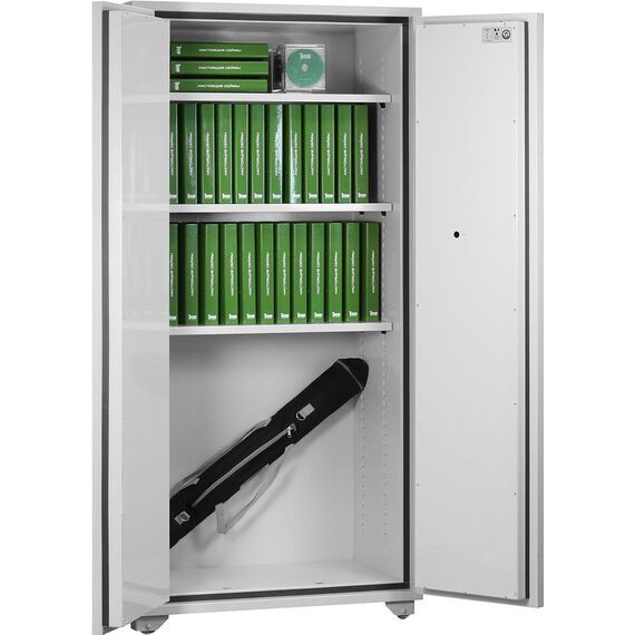 В оптимизированные габариты сейфа Diplomat PRC302 умещается полных пять рядов стандартных канцелярских папок А4 типа Корона, при необходимости хранения документов другого формата, возможно установить дополнительные полки. Запирание сейфа может осуществляться как ключевым, так и несколькими типами электронных замков. Для удобства перемещения по офису сейф оборудован колесами высотой 60 мм.