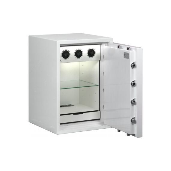 Сейф в эксклюзивном исполнении белого цвета, с модулем для подзавода часов, подсветкой, блоком для заряда гаджетов, стеклянной полкой и двумя выдвигаемыми ящиками для ювелирных украшений представлен на фотографиях и в выставочном зале.