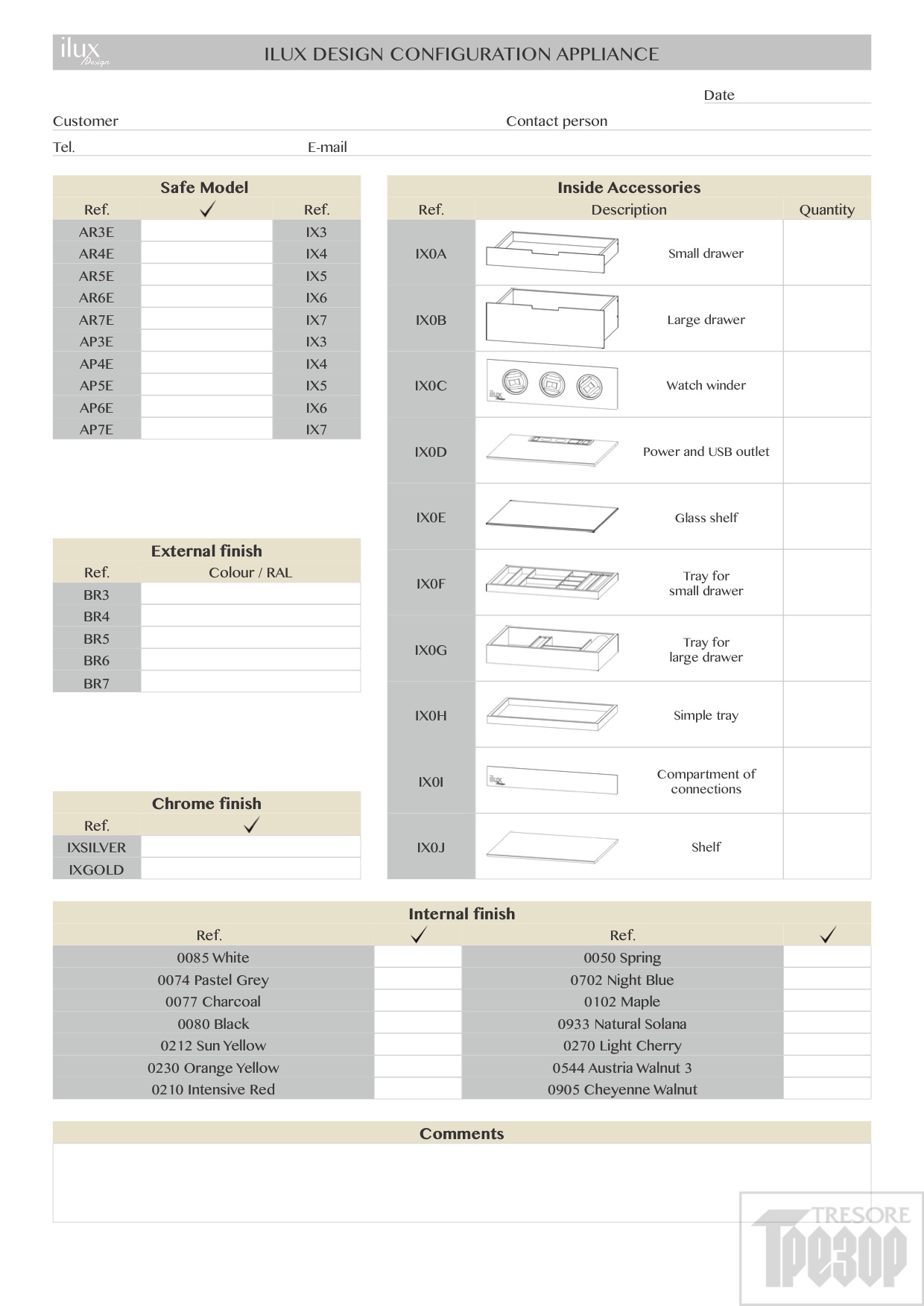 Сейфы изготавливаются в индивидуальных комплектациях на заказ. Бланк для заполнения находится в разделе "Документы". Доступные элементы интерьера: