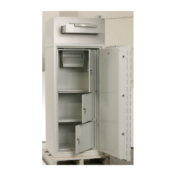 Депозитное решение на базе сейфа KASO PTK E3-330. Сейф сертифицирован на 3-й класс защиты от взлома в соответствии с европейским стандартом CEN 1143-1 (собственно сейф) и CEN 1143-2 (депозитный механизм). Огнестойкость - 60P.