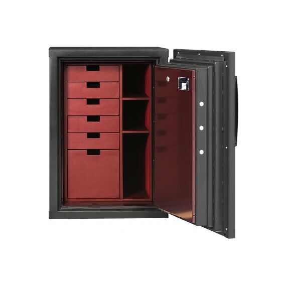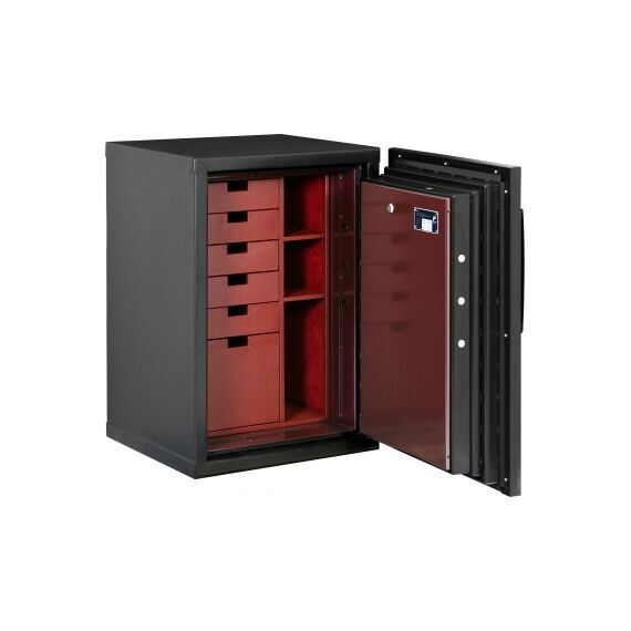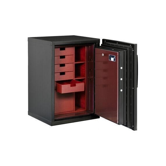 Отличный сейф для ценностей и документов: 3-й европейский класс взломостойкости гарантирует противостояние самому серьёзному инструменту в руках профессионального взломщика, плюс полная 60-минутная огнестойкость, так же сертифицированная по европейскому нормативу. Производится финским заводом KASO OY, расположенным в черте г.Хельсинки, при этом этот завод - единственный во всей Скандинавии. Декоративные панели под дерево или окрашенные в любой цвет как в матовом, так и в глянцевом исполнении по RAL (данная модель представлена в черном цвете), позволяют ему вписаться в любой интерьер. При этом на полу сейф занимает места не больше, чем обычная стиральная машина, то есть легко уместится среди мебели.