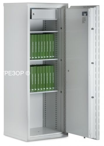 Сейф KASO PTK E2-340E с электронным замком оснащен полками расчитанными на хранение документов в папках A4 (количеством до 36 штук) и запираемым ящиком высотой 150 мм.