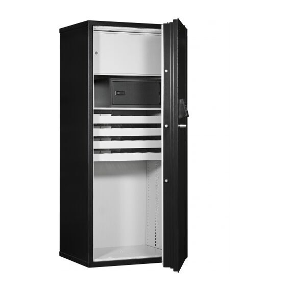 Изображённый экземпляр оснащён опциональным двухсистемным замком PAXOS, запираемым отделением высотой 350 мм четырьмя выдвижными универсальными лотками и модулем для хранения магнитных носителей. Стоимость этой комплектации на условиях свободно со склада в Москве 22,998.00 евро, вкл. НДС.
