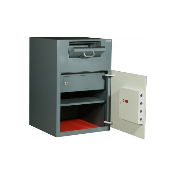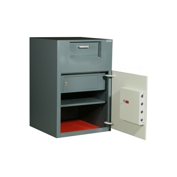 Депозитный сейф Diplomat DS30E — надежное решение для тех, кто работает с наличными деньгами. Он выполнен из высокопрочной стали толщиной 10 мм и крепится к полу 4-мя анкерными болтами, что исключает возможность выноса сейфа из помещения. Банкноты, размещенные в верхнем отделении, автоматически сбрасываются в нижнее, защищенное дверью с массивной ригельной конструкцией и высоконадежным электронным замком EDL.