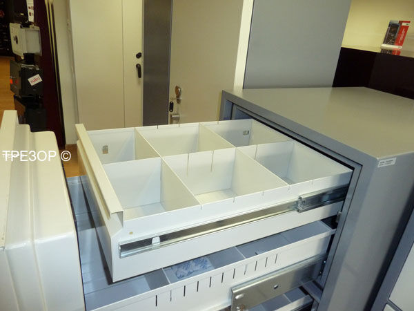 Специальное исполнение, разработанное для оптимального хранения малоформатных документов (бланки паспортов, трудовых и медицинских книжек и т.п.) оснащено дополнительным выдвигаемым ящиком в каждом их 3-х основных отсеков.