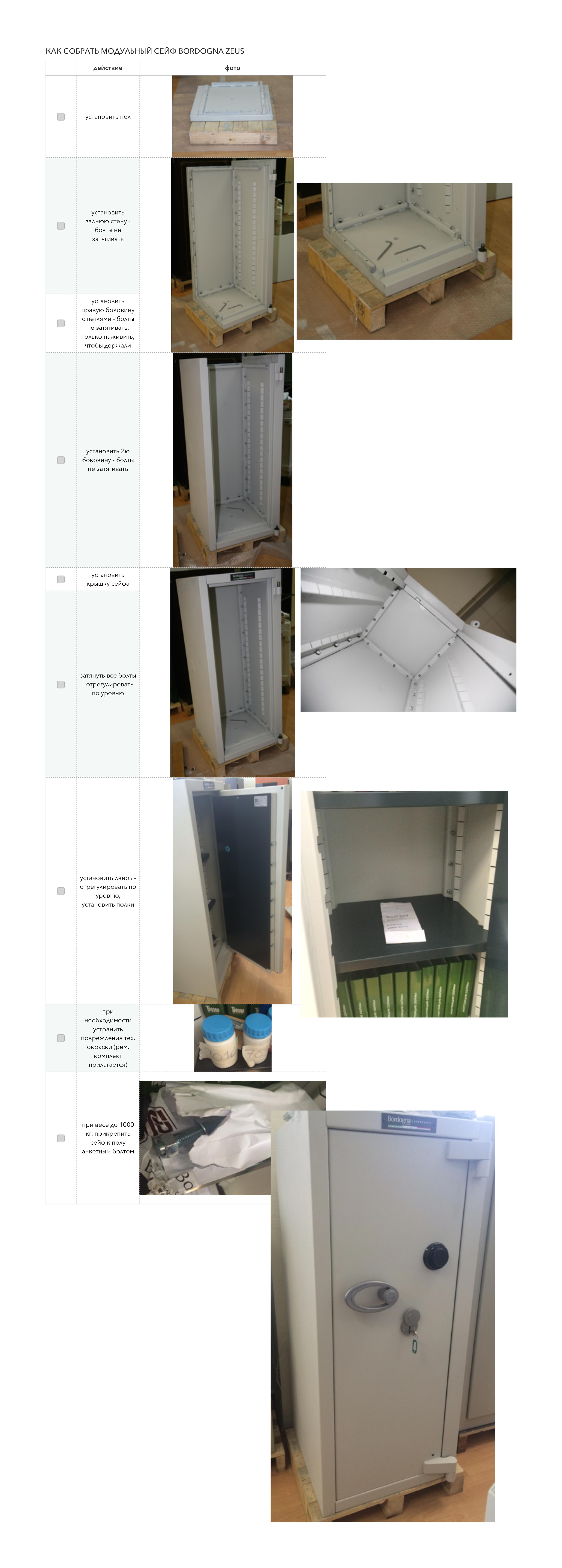 Поставляется по РФ в разобранном виде (1 европаллета), удобная сборка, фото-инструкция прилагается. Базовая спецификация оснащена одним ключевым и одним механическим кодовым замками. По предварительному заказу возможна установка любого сочетания замков: ключевой + электронный, механический + электронный, два независимых электронных замка. Электронные замки могут быть как базовые, так и разной степени продвинутости. В том числе доступен и самый передовой на рынке Техмастер, с возможностью управления обоими замками с одной клавиатуры.